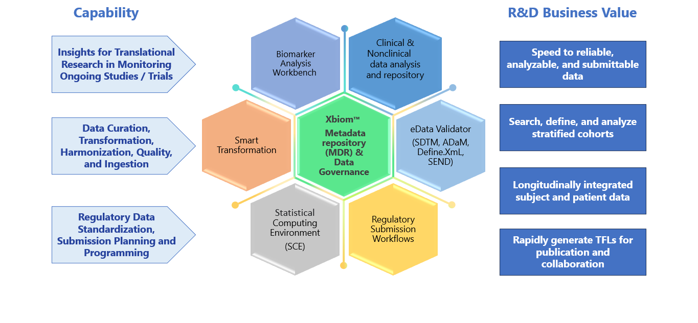 Xbiom™ manages data and documents through the lifecycle and the supply-chain of data from nonclinical studies and clinical trials while streamlining the interactions with various CROs, Specialty and Bio-Analytics labs, Bio-Metrics teams, data standards and terminology management, analytics, TFLs, report generation and packaging of submittable data into eCTD M4 and M5 folders. A series of workflows and tools for various transformations, conformance to standards, validation to standards and Technical Conformance Guides, and packaging under a 21 CFR Part 11 environment provide a compelling, cost-saving facility for sponsors and their regulatory or operations teams.